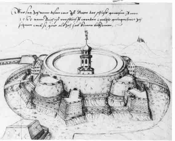 Trutzburg mit starker Wallbefestigung und ausgelagerten Bastionen.