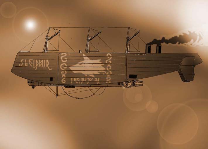 Inzwischen weiß sie, dass die Vulkane ihres Landes alles Andere als ein Fluch sind... sie sind ein Segen. Alt und stabil, wie sie sind, läuft ihre Aktivität in geregelten Bahnen – und diese komisch riechende Luft, die aus den Erdlöchern strömt ist nicht nur dazu gut, einem die Stimme lustig zu verstellen, wenn man sie einatmet – nein; inzwischen weiß sie, daß das ein Gas ist. Und es ist etwa 9-mal leichter als die normale Luft. Was wäre, wenn man diese Luft in einem großen imprägnierten Leinensack einfängt? Dann hätte man einen Ballon. Und dieser wäre in der Lage, jemanden, der unten dran hängt, zum Fliegen zu bringen. Und schon sitzt Sigurd vor ihrem Skizzenblock – und es entsteht ein großes, schiffähnliches Gerät, das gleich mehrere doppelwandige mit Harz und Tran imprägnierte, selbstdichtende Gaszellen enthält – mit genügend Auftriebskraft, vielen Leuten samt Ausrüstung das Reisen durch die Luft zu ermöglichen. Sie nennt es `Luftschiff´. Ein solches Luftschiff braucht gleich mehrere Ruder, da Luft wesentlich dünner ist als Wasser – es braucht auch eine Art Antrieb. Das einfache Prinzip der Verdrängung durch Änderung des Aggregatzustandes bringt Sigurd auf den Gedanken eines riesigen Kessels, aus dem Wasserdampf mit großem Druck aus einer Düse austritt. Sozusagen ein Rückstoßantrieb. Kleinere nach vorn gerichtete Düsen dienen zum Abbremsen des Schiffes. Sollte der Brennstoff ausgehen, gibt es auf der Oberseite immer noch drei Masten mit einer Behelfstakelung. Wartungsgänge ziehen sich durch den gesamten Gaskörper, der aus Eschenholz mit bespannter und imprägnierter Leinwand besteht. In Abständen von etwa 20 Metern ziehen sich Drähte von oben nach unten durch das Schiff, um Odin´s Zorn abzuwehren (Blitzschläge), deren Wirkung Sigurd nur allzu genau kennt. Der Steuerstand, die Kombüse, das Feldscherlager, die Unterkünfte und Batterien der Bordkanonen sind im unteren Drittel untergebracht. Es gibt an den Wandungen und auf der Oberseite noch Stände mit Falconets, die zu Sechserbündeln drehbar zusammengeschlossen sind, Diese können einen verheerenden Feuerstoß auf eventuelle fliegende Feinde abfeuern. Sigurd denkt gern in Maßstäben der Sicherheit. An den Antriebskessel angeschlossen ist eine Werkstatt, die Holz und Metall verarbeiten kann – sowie eine Näherei. Warum dies alles? Das Schiff soll so autark wie möglich sein – denn Sigurd hat vor, ein Expeditionsschiff zu entwickeln. Um dahin zu kommen wo noch niemand vor ihr war. Sie ist neugierig.